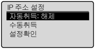 를 누릅니다.![]() ![]() DHCP/BOOTP/RARP를 사용하여 IP 주소를 할당하지 않으려면 <해제>를 선택하십시오. <DHCP>, <BOOTP> 또는 <RARP>를 사용할 수 없을 때 이러한 서비스를 선택한 경우 네트워크에서 이를 검색하는 데 시간과 통신 자원을 낭비하게 됩니다. |