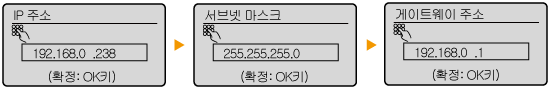 <서브넷 마스크> <게이트웨이 주소>.숫자 키를 사용하여 각 설정을 입력하고 각 화면에서