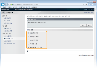 WSD를 통해 컴퓨터에서 기기에 대한 정보를 얻으려면 확인란을 선택합니다. 이 확인란은 [WSD 인쇄 사용] 확인란이 선택된 경우 자동으로 선택됩니다. [WSD 스캔 사용]