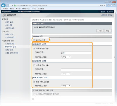 [커뮤니티명 1 사용] 또는 [커뮤니티명 2 사용] 확인란을 선택하고 [커뮤니티명] 텍스트 상자에 커뮤니티명을 입력하고 [MIB 액세스 제한] 설정을 지정합니다.