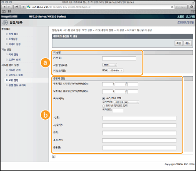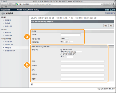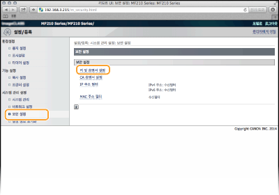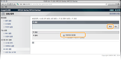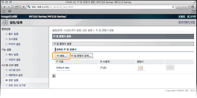 TLS(Transport Layer Security)를 통한 암호화된 통신에 필요한 경우 기기에서 키 쌍을 생성할 수 있습니다. AirPrint를 사용하기 위해 Apple 장치에서 액세스할 때 TLS를 사용할 수 있습니다. 최대 3개의 키 쌍을 기기에 등록할 수 있습니다.
