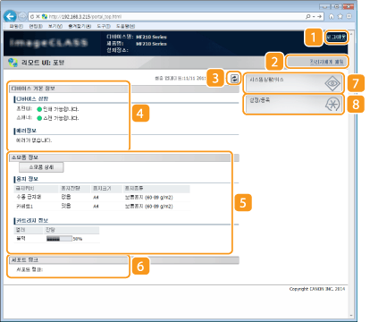 기기의 현재 상태 및 에러 정보를 표시합니다. 에러가 발생하면 에러 정보 페이지의 링크가 표시됩니다.