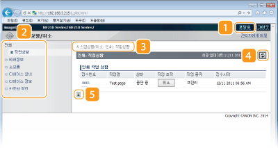 현재 인쇄 문서의 상태와 문서 인쇄, 복사 기록을 표시합니다. 기기의 상태를 확인할 수도 있습니다.