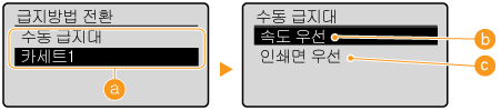 용지), 용지 공급원에 <속도 우선>이 대신 적용됩니다. 이 경우 <속도 우선>이 선택된 경우와 같은 방법으로 용지를 적재해야 합니다(