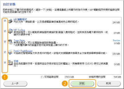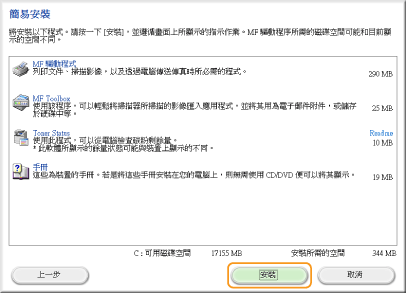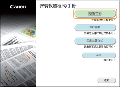 您可選擇透過 [簡易安裝] 安裝標準軟體和電子手冊,或透過 [自訂安裝] 指定要安裝的軟體和手冊。