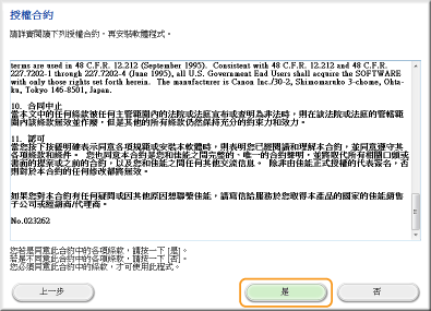 閱讀「授權合約」,然後按一下 [是] 以同意。