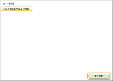選取 [立即重新啟動電腦(建議)] 核取方塊,然後在移除 CD-ROM/DVD-ROM 後按一下 [重新啟動]。