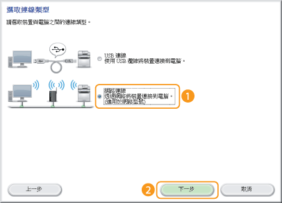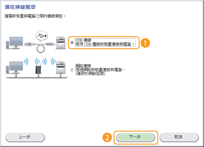 選取 [USB 連線],然後按一下 [下一步]。