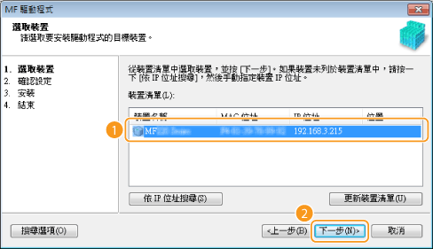 檢視網路設定(電子手冊)),然後按一下 [更新裝置清單]。若本機仍然未顯示,請按一下 [依 IP 位址搜尋]