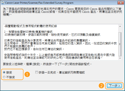 仔細閱讀下列畫面中的資訊,選取 [接受] 或 [不接受],然後按一下 [下一步]。