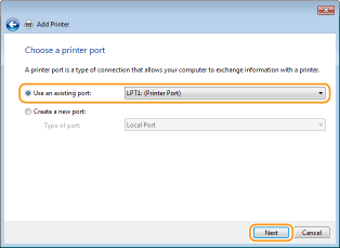 Check that [LPT1] is selected under [Use an existing port], and click [Next].