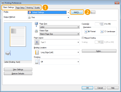 Specifying combinations of settings such as "1-sided landscape orientation on A4 size paper in save toner mode" every time you print is time consuming. If you register your frequently used combinations of print settings as "profiles," you can specify print settings simply by selecting one of the profiles from the list. This section explains how to register profiles and how to print using profiles.