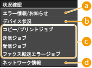 を押すと、印刷や送受信といった文書の状況だけでなく、トナーカートリッジ残量などの本体の状況や、IPアドレスなどのネットワーク設定の情報も確認できる画面が表示されます。
