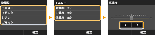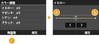 イエロー(黄色)、マゼンタ(明るい赤紫色)、シアン(明るい青色)、ブラック(黒色)の強弱を調整します。