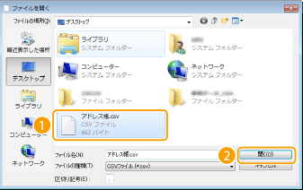アドレス帳に読み込むデータを選び、[開く]をクリックする