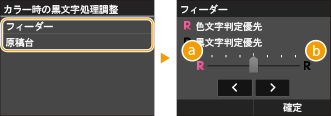 カラーコピーで黒い文字や黒っぽい色の文字が思いどおりにコピーできなかった場合に、コピー結果が原稿により近くなるように調整できます。フィーダーからの読み込みと原稿台ガラスからの読み込みのそれぞれに対して設定できます。