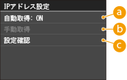 ![]() <ON>のときは<自動取得>をタップしたあと、<プロトコル選択>と<Auto IP>を<OFF>に設定します。