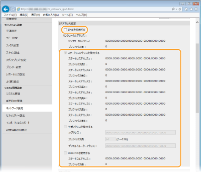 IPv6アドレスはリモートUIを使って設定します。IPv6アドレスを使うためには、IPv4アドレスが適切に設定されている必要がありますのであらかじめ確認しておいてください(IPv4の設定を確認する)。また、IPv6環境ではスキャナードライバーやMF Scan Utilityによるスキャンはできませんのでご注意ください。IPv6は、次のように最大で9アドレスを登録できます。