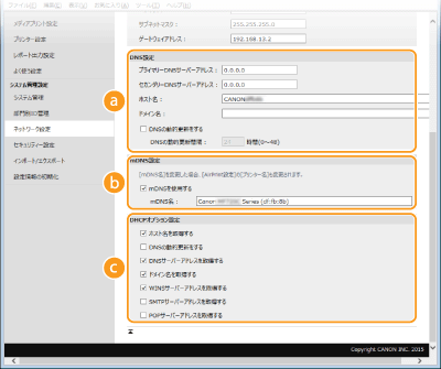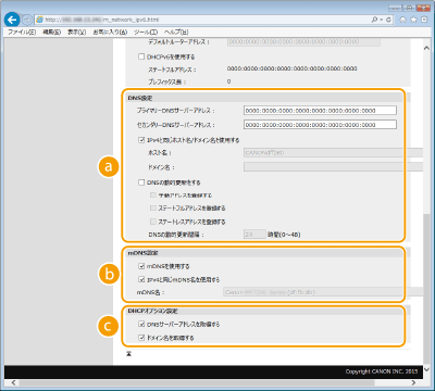 DHCP環境などで、ホスト名とIPアドレスの対応付けが変更されたときに自動更新するにはチェックマークを付けます。DNSサーバーに登録したいアドレスの種類を指定するときは、必要に応じて[手動アドレスを登録する]、[ステートフルアドレスを登録する]、または[ステートレスアドレスを登録する]にチェックマークを付けます。更新間隔を変更するときは、[DNSの動的更新間隔]に時間単位で入力します。 [mDNS設定][mDNSを使用する]