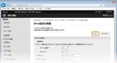 DNSサーバーのIPアドレスを入力します。「ff」で始まるアドレス(マルチキャストアドレス)は入力できません。 [セカンダリーDNSサーバーアドレス]