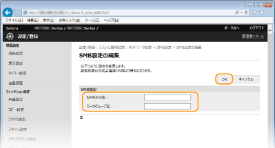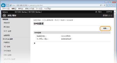 SMBは、ネットワーク内の複数デバイス間でファイルやプリンターを共有するためのプロトコルで、本機ではスキャンした文書を共有フォルダーに保存するときなどに使用します。お使いのネットワーク環境によっては、NetBIOS名とワークグループ名の設定が必要です。