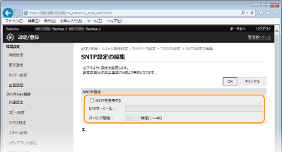 SNTPはネットワーク上のタイムサーバーを基準にして時刻を調整するためのプロトコルです。LDAPサーバーへのアクセスでセキュリティー認証を行うときなど、本機とサーバー間で時刻を同期させる必要がある場合に使用します。協定世界時(UTC)を基準に動作するので、時差(タイムゾーン)をあらかじめ設定しておいてください(日付/時刻の設定)。SNTPの設定はリモートUIを使って行います。