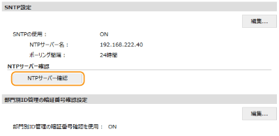 [ネットワーク設定] [TCP/IP設定]をクリックして表示される[SNTP設定]の[NTPサーバー確認]をクリックします。正しく接続されているときは下の画面のように表示されます(ただし、このときは通信状況を確認するだけで、時刻合わせは行いません)。![]() |