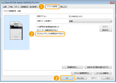 [デバイスの設定]タブをクリックし、[セキュアプリントの使用を許可する]にチェックマークが付いているか確認する