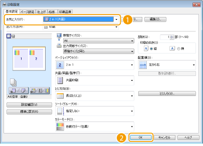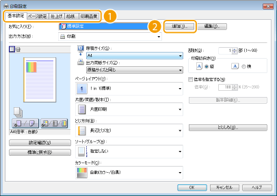 必要に応じて[基本設定]、[ページ設定]、[仕上げ]、[給紙]、[印刷品質]タブから設定を行います。