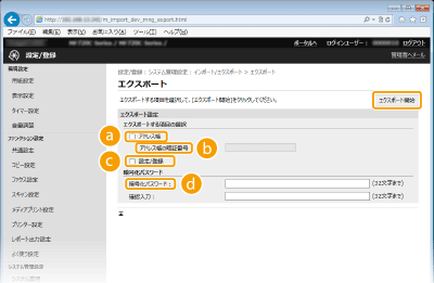 本機の各種設定値をエクスポートする場合は、チェックマークを付けます。