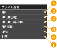 読み込んだ原稿のファイル形式を何にするか選ぶことができます。PDF/JPEG/TIFFの中から選びます。PDFは、データサイズが小さな高圧縮PDFや、OCR(光学式文字認識)でテキスト検索を可能にしたPDF形式を選択できます。