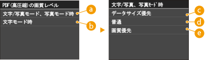 <PDF(高圧縮)>や<PDF(高圧縮/OCR)>を選ぶと<PDF>や<PDF(OCR)>よりも写真やイラストなどの画像がより圧縮され、データサイズが小さくなります。ただし、原稿の種類によっては画質が低くなったり、一度に読み込める原稿の枚数が少なくなったりすることがあります。<PDF(高圧縮)>や<PDF(高圧縮/OCR)>を選んだ場合、圧縮の度合いを細かく設定することができます。