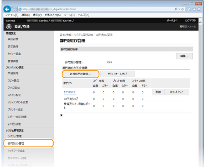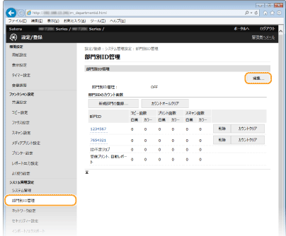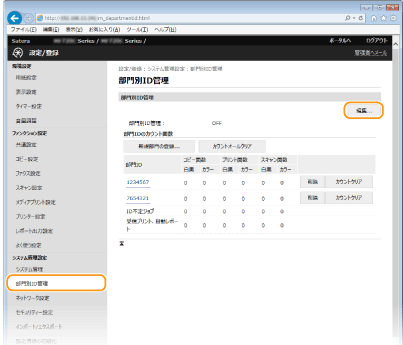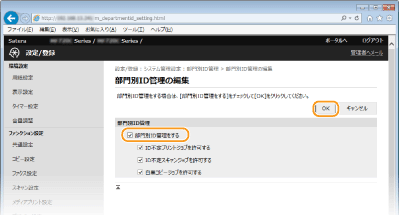[部門別ID管理機能を使う]にチェックマークを付け、右側にある[設定]をクリックする