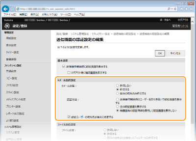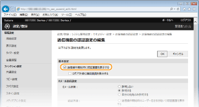 認証送信のログイン画面で入力したユーザー名とパスワードでサーバーに認証します。[認証画面を表示する]にチェックマークを付けると、送信実行時にこれらのユーザー名とパスワードを引き継いだ状態の認証画面を表示します。