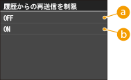 送信履歴から宛先指定することを禁止します。禁止すると「ファクス送信」、「スキャンしてEメール送信」、「スキャンして共有フォルダーやFTPサーバーに保存」の各機能で、履歴から宛先を選択できなくなります。