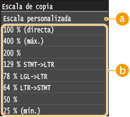 Puede ampliar o reducir las copias utilizando una escala de copia preestablecida, como por ejemplo <STMT->LTR>, o estableciendo una escala de copia personalizada en incrementos del 1%.