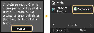 Si selecciona <Sí>, aparecerá un mensaje. Compruebe el mensaje y, a continuación, pulse <Aceptar>. La combinación de opciones registrada se agregará a la pantalla <Inicio> como un botón de acceso directo.