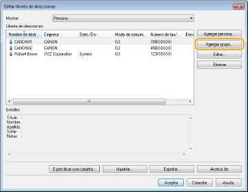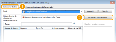 Esta sección describe cómo registrar destinos en la libreta de direcciones para los faxes de PC. Puede seleccionar destinos únicos entre los destinos registrados en la libreta de direcciones para crear un destino de grupo (Marcación por Grupo), que resulta útil para realizar envíos a varios destinos al mismo tiempo.