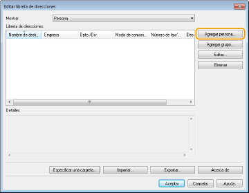 Para cambiar o eliminar destinos registrados, seleccione un destino en [Libreta de direcciones], y haga clic en [Editar] o [Eliminar].