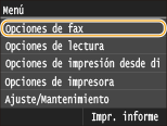Todas las opciones sobre el fax se muestran con descripciones breves. Las opciones predeterminadas aparecen marcadas con una cruz (  ).