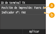 Especifica la posición para imprimir la información del ID del terminal en el fax enviado. Seleccione <Dentro del área de la imagen> para imprimir la información dentro del área de imágenes, o <Fuera del área de la imagen> para imprimir la información fuera del área de imágenes.