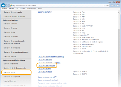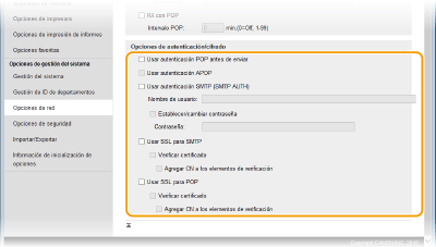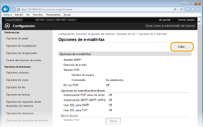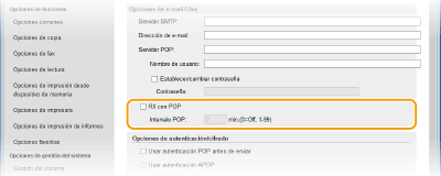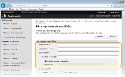Utilice la IU remota para configurar las opciones detalladas de envío y recepción, como pueden ser las opciones para utilizar el equipo para enviar y recibir I-Faxes y las opciones para la autenticación de POP y el cifrado antes de enviar e-mail o I-Faxes. Póngase en contacto con su proveedor o administrador de red para obtener la configuración necesaria.