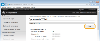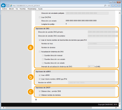 Seleccione la casilla de verificación para utilizar el mismo nombre de mDNS que en IPv4. Para configurar un nombre diferente, quite la marca de la casilla de verificación e introduzca el nombre de mDNS en el cuadro de texto [Nombre de mDNS]. [Opciones de DHCP][Obtener direc. servidor DNS]