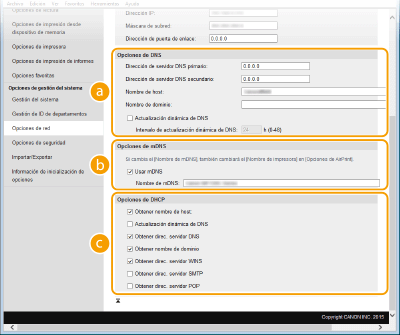 Seleccione la casilla de verificación para actualizar dinámicamente los registros DNS cuando cambie la dirección IP del equipo. Cuando especifique el intervalo entre las actualizaciones, introduzca el tiempo en horas en el cuadro de texto [Intervalo de actualización dinámica de DNS]. [Opciones de mDNS][Usar mDNS]