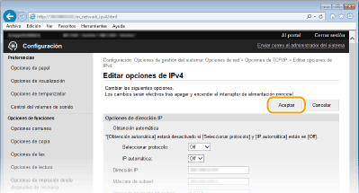 Selección de opciones desde el panel de controlTambién es posible acceder a las opciones de DNS desde <Menú> en la pantalla <Inicio>. Opciones de IPv4 Opciones de IPv6