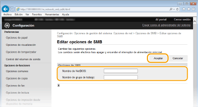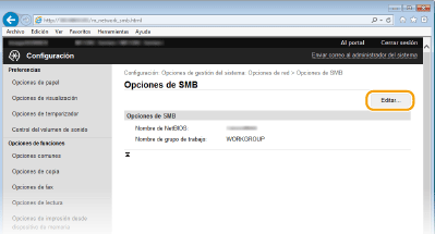 Bloque de mensajes del servidor (SMB) es un protocolo para compartir recursos, como archivos e impresoras, con más de un dispositivo en una red. El equipo utiliza SMB para guardar los documentos leídos en una carpeta compartida. En función de la red, es posible que deba configurar el nombre de NetBIOS y el nombre del grupo de trabajo.