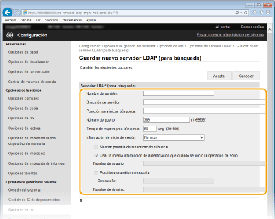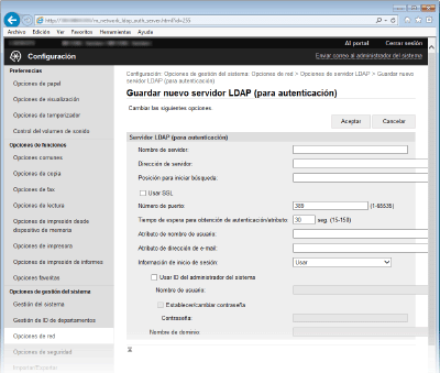 Haga clic en [Guardar nuevo servidor] para [Servidor LDAP (para búsqueda)] o [Servidor LDAP (para autenticación)].