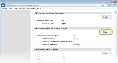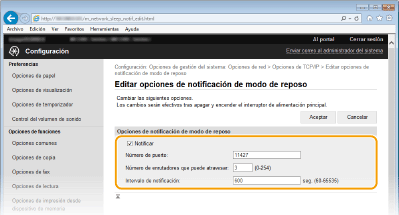 Marque la casilla de verificación para informar a un software de administración de dispositivo del estado de energía del equipo. Si se selecciona [Notificar], el equipo evitará las comunicaciones innecesarias durante el modo de reposo y reducirá el consumo total de energía. [Número de puerto]