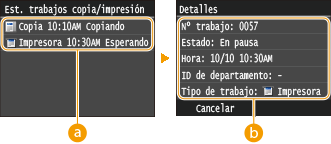 ![]() <Est. trabajos copia/impresión>Muestra la lista de documentos que se están procesando, copiando o a la espera de procesarse.