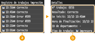 ![]() <Registro de trabajos impresión>Muestra la lista de documentos impresos. <Correcto> aparece cuando un documento se imprime correctamente, y <Error> aparece cuando un documento no se imprime correctamente porque se canceló o se produjo algún error.